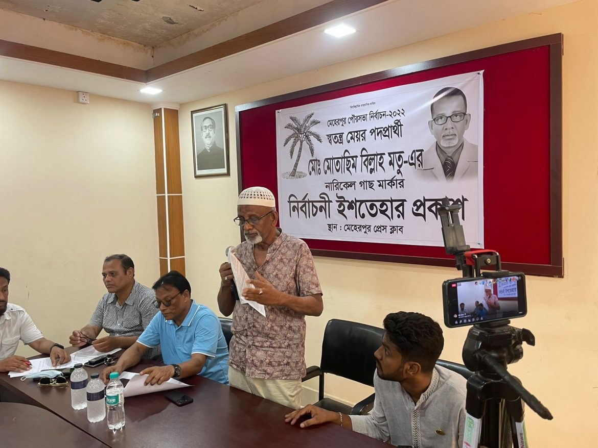 মেহেরপুর পৌর নির্বাচনে সতন্ত্র প্রার্থী মোতাছিম বিল্লাহ মতু নির্বাচনী ইসতেহার ঘোষনা করেছেন। আজ শনিবার মেহেরপুর প্রেসক্লাবে এ নির্বাচনি ইসতেহার ঘোষনা করেন। নির্বাচনী ইসতেহার ঘোষনার আগে তিনি বলেন পৌর নির্বাচন নিয়ম অনুযায়ী ৫ টির উপর নির্বাচিনী অফিস করার কোন সুযোগ নেই কিন্তুু আওয়া মীলীগের প্রার্থী মাহফুজুর রহমান রিটন অন্ততো ৫০ টির অধিক নির্বাচনি অফিস করে নির্বাচনের আচারণ বিধি লংঘন করেছেন। এ ছাড়া তিনি ও তার সমার্থিত লোকজন আমার স্টিকারের ওপর স্টিকার মারছেন। পোস্টার ছিড়ে দিচ্ছেন। নির্বাচন আচারণ বিধি ভেঙ্গে পথ সভা করছেন। আমার কর্মীরা রাস্তায় বেরালে তাদের ছবি তুলে দেখে নেবার হুমকী দিচ্ছেন। আমার প্রচার ম্যানকে মারধর করার হুমকী প্রদান করছেন। এ বিষয়ে রিটানিং কর্মকর্তা , নির্বাচন কমিশন জেলা নির্বাচন অফিসার সহ সংশ্লিষ্ট্য দপ্তরে পাঁচের অধিক লিখিত অভিযেগ দিয়েছি কিন্তু এখনও কোন ব্যবস্থা নেওয়া হয়নি। তিনি আরো বলেন সারা শহরের রাস্তায় ময়লা আর দুগন্ধে হাটা যায়না। ১৬ লক্ষ টাকায় ইজরা দেওয়া গড় পুকুর ইজরা দারদের কাছ থেকে জোর করে দখল নিয়ে এই ৫ বছর তার ছেলেরা ভোগ দখল করছে। এতে পৌরসভার রাজস্ব ক্ষতি হয়েছে । পৌর সভার কর্মকর্তা কর্ম চারিদের ২৮ মাসের বেতন বাকি। ৮০ লক্ষ টাকা বিদ্যুৎ বিল বাকি।