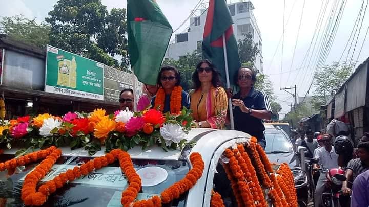 এর আগে সড়ক পথে নিলা কুষ্টিয়া-রাজবাড়ি সড়কের মীর মশাররফ হোসেন সেতুতে পৌঁছালে সেখানে জেলা প্রশাসন ও জেলা ক্রীড়া সংস্থার পক্ষ থেকে আফরোজা আক্তার ডিউ, ফুল দিয়ে বরণ করে নেয়া হয়। পরে খোলা ট্রাকে করে তাকে নিয়ে শহরের দবির মোল্লা রেলগেট, মিলপাড়া, বড়বাজার, এনএস রোড হয়ে শিল্পকলা একাডেমিতে পৌঁছালে জেলা প্রশাসক ও পুলিশ সুপার তাকে আবারো ফুল দিয়ে বরণ করে নেন।