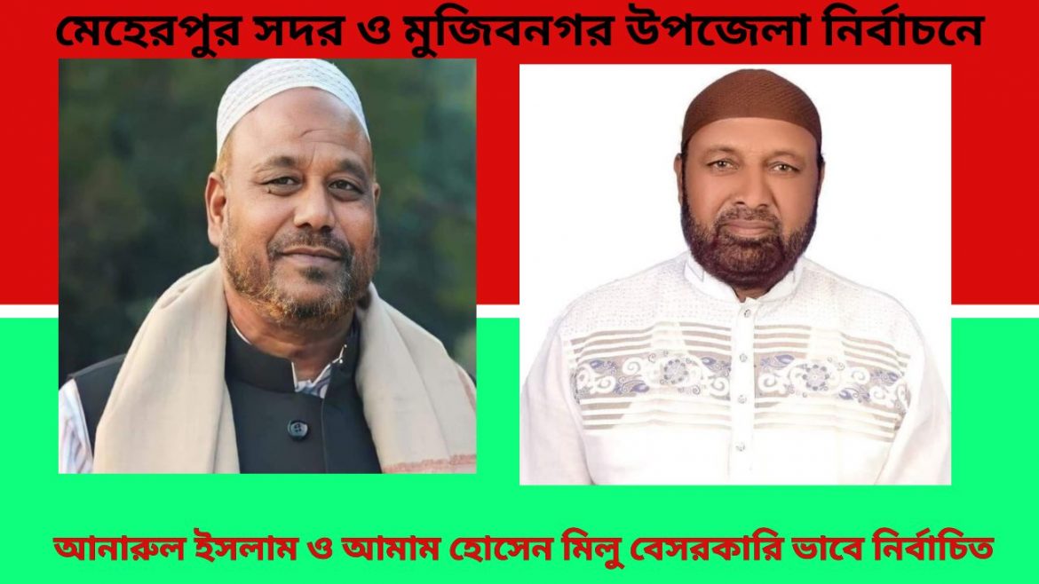 মেহেরপুর সদর ও মুজিবনগর উপজেলার নির্বাচনে আনারুল ইসলাম ও আমাম হোসেন মিলু বেসরকারি ভাবে নির্বাচিত হয়েছে । বুধবার সন্ধায় জেলা নির্বাচন কর্মকর্তা মোঃ ওয়ালীউল্লাহ তার নিজ কার্যালয়ে আনারুল ইসলাম ও আমাম হোসেন মিলু কে নির্বাচিত বেসরকারি ভাবে ঘোষনা করে