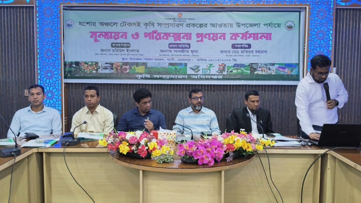 যশোর অঞ্চলে টেকসই কৃষি সম্প্রসারণ প্রকল্পের আওতায় উপজেলা পর্যায়ে মূল্যায়ন ও পরিকল্পনা প্রণয়ন কর্মশালা মেহেরপুরের গাংনীতে অনুষ্ঠিত হয়েছে। বৃহস্পতিবার (৫ মার্চ) সকালে গাংনী উপজেলা পরিষদের সভাকক্ষে এ কর্মশালা অনুষ্ঠিত হয়।