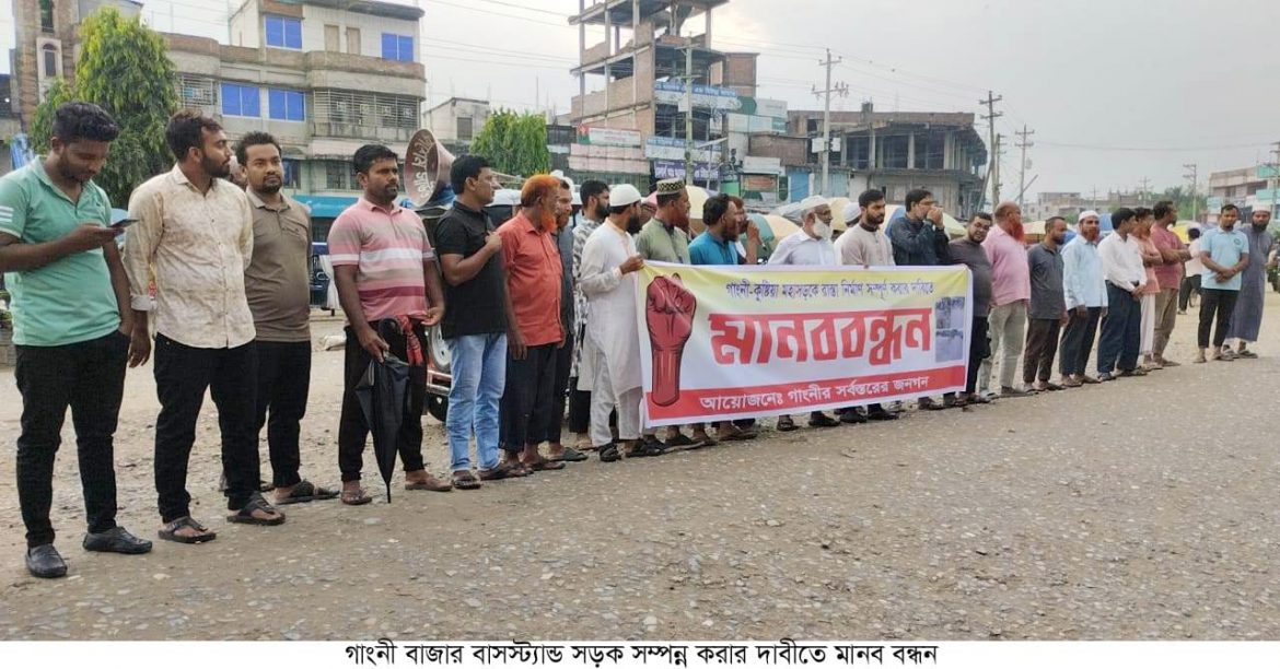 মানববন্ধনে গাংনী বাজারের ব্যবসায়ী, শিক্ষক, রাজনৈতিক নেতা, ছাত্র, সমাজকর্মীসহ সর্বস্তরের মানুষ অংশ নেন। বক্তারা সরকারের দৃষ্টি আকর্ষণ করে জানান, দ্রুত সড়ক নির্মাণ শেষ করে গাংনীর অর্থনৈতিক প্রাণকেন্দ্র বাজারটিকে সচল রাখা সময়ের দাবি।