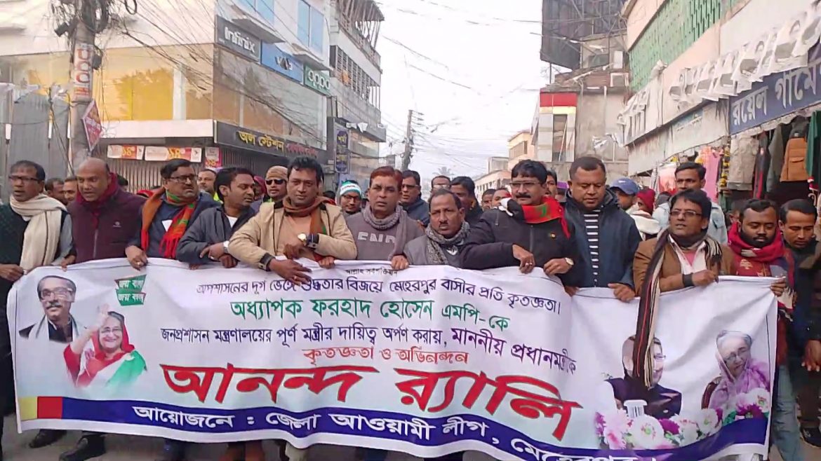আনন্দ মিছিলে জেলা আওয়ামী লীগের যুগ্ম সাধারণ সম্পাদক অ্যাড: ইব্রাহিম শাহীন, শহর আওয়ামী লীগের সভাপতি ইকবাল হোসেন বুলবুল, মেহেরপুর সদর থানা আওয়ামীলীগের সাধারন সম্পাদক ও বারাদি ইউনিয়ন পরিষদের চেয়ারম্যান মোমিনুল ইসলাম মোমিন, কুতুবপুর ইউনিয়ন পরিষদের চেয়ারম্যান সেলিম রেজা, শ্যামপুর ইউনিয়ন পরিষদের চেয়ারম্যান মতি্উর রহমান মতিন, বুড়িপোতা ইউনিয়ন পরিষদের চেয়ারম্যান শাহজামাল আমদাহ ইউনিয়ন পরিষদের চেয়ারম্যান রওশন আলী টোকন। সহ আওয়ামী লীগ, যুবলীগ,ছাত্র লীগ ও মহিলা আওয়ামী লীগের নেতাকর্মীরা অংশ নেয়।