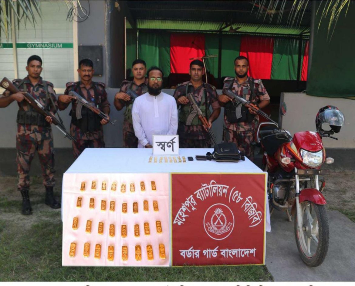 বর্ডার গার্ড বাংলাদেশ ( বিজিবি) প্রেস বিজ্ঞপ্তিতে জানান সীমান্ত পিলার- ৪৭/৩-এস হতে আনুমানিক ৭০০ গজ বাংলাদেশের অভ্যন্তরে মহেশপুর থানার বড়বাড়ী গ্রামের বি.কে. নিম্ন মাধ্যমিক বালিকা বিদ্যালয় হতে পশ্চিম দিকে রাস্তার পার্শ্বে চোরাচালানী অভিযান পরিচালনা করে। উক্ত অভিযানে বিজিবি টহলদল ব ৩.৭২০ কেজি ওজনের ৩২টি স্বর্ণের বার, ০১টি মোটরসাইকেল ও নগদ ৭,৪০০/- টাকাসহ স্বর্ণ পাচারকারী মোঃ ইমাম হুসাইন (৩৩) কে আটক করে।