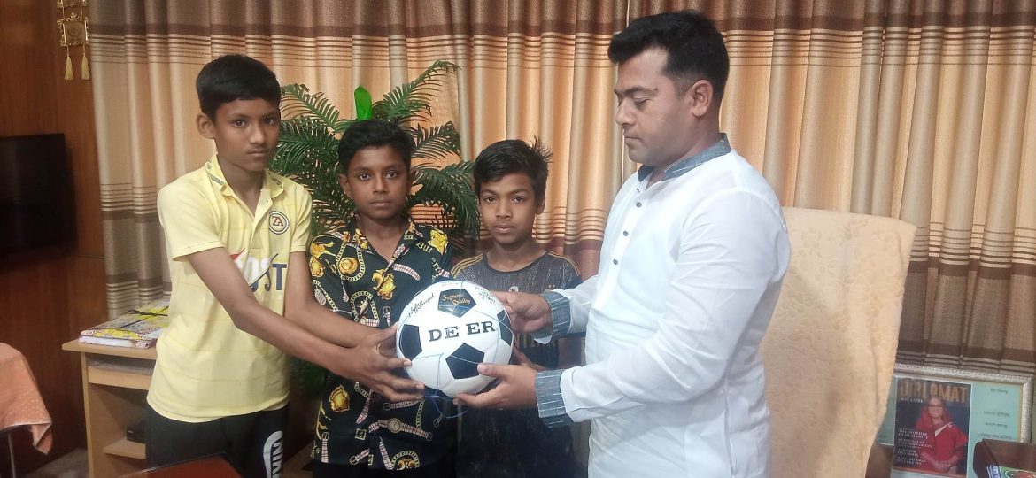পৌর মেয়র দপ্তর থেকে বল নিয়ে হাসি মুখে ফিরলেন তিন শিশু