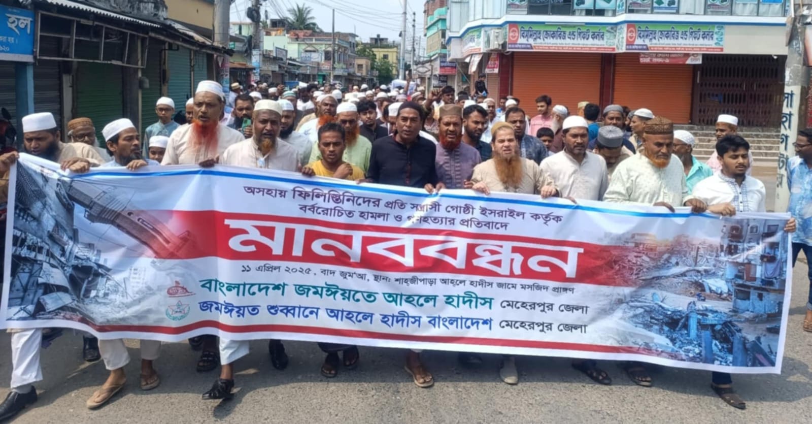 অসহায় ফিলিস্তিনিদের ওপর সন্ত্রাসী রাষ্ট্র ইসরাইলের বর্বরোচিত হামলা ও গণহত্যার প্রতিবাদে মেহেরপুরে মানববন্ধন ও বিক্ষোভ মিছিল অনুষ্ঠিত হয়েছে। বাংলাদেশ জমঈয়তে আহলে হাদিস মেহেরপুর জেলা শাখা ও জমঈয়তে শুব্বানে আহলে হাদিস মেহেরপুর এর উদ্যোগে এ কর্মসূচির আয়োজন করা হয়।
