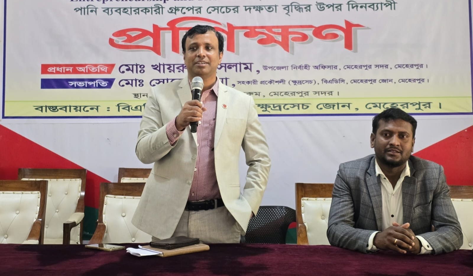 প্রশিক্ষণ কর্মশালার সভাপতিত্ব করেন বিএডিসি মেহেরপুর জোন (ক্ষুদ্রসেচ) এর সহকারী পরিচালক সোহেল। প্রধান অতিথি হিসেবে উপস্থিত ছিলেন সদর উপজেলা নির্বাহী অফিসার মোঃ খায়রুল ইসলাম।