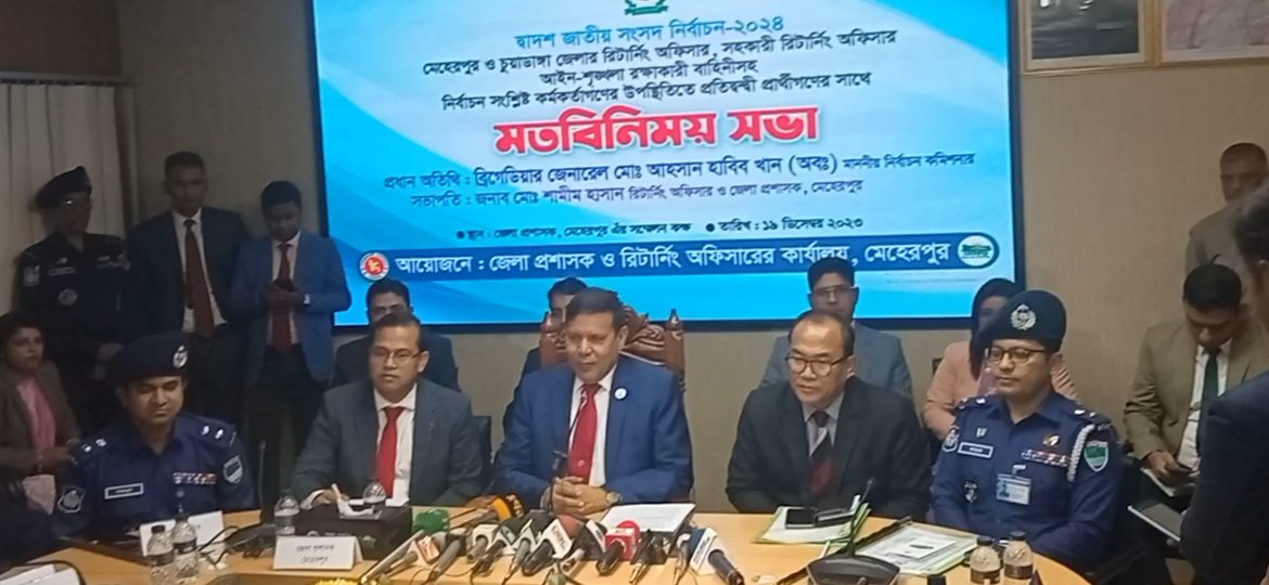 নির্বাচন কমিশনার ব্রিগেডিয়ার জেনারেল মোঃ আহসান হাবিব খানের (অব:) সাথে দ্বাদশ জাতীয় সংসদ নির্বাচনে মেহেরপুর ও চুয়াডাঙ্গা জেলার চারটি সংসদীয় আসনে প্রতিদ্বদœ¦ী প্রার্থী সহ আইনশৃঙ্খলা বাহিনী ও প্রশাসনের সাথে মতবিনিময় সভা শেষে সাংবাদিকদের প্রশ্নের জবাবে এমন কথা বলেন। মঙ্গলবার বিকালে মেহেরপুর জেলা প্রশাসকের সম্মেলন কক্ষে এই মত বিনিময় সভা অনুষ্ঠিত হয়। এ সময় মেহেরপুর-১ আসনের স্বতন্ত্র প্রার্থী আওয়ামীলীগের সাবেক সাংসদ প্রফেসর আব্দুল মান্নান, নৌকা প্রার্থী জনপ্রশাসন প্রতিমন্ত্রী ফরহাদ হোসেনের বিরুদ্ধে সরকারী সুযোগ সুবিধা গ্রহণ এবং প্রটোকল ও পুলিশ প্রটেকশন ব্যবহার করে নির্বাচনে প্রভাব বিস্তার করছেন বলে ইসিকে অভিযোগ করেন।