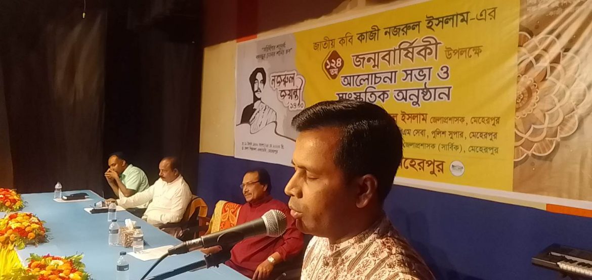 জাতীয় কবি ও বিদ্রোহী কবি কাজী নজরুল ইসলামের ১২৪ তম জন্ম বার্ষিকী উপলক্ষে জেলা প্রসাশন মেহেরপুর এর আয়োজনে আলোচনাসভা ও সংস্কৃতিক অনুষ্ঠান অনুষ্ঠিত হয়েছে। আজ বৃহস্পতিবার ২৫/০৫/২০২৩ তারিখ রাত ৮টায় মেহেরপুর জেলা শিল্পকলা একাডেমীতে এয় অনুষ্ঠান অনুষ্ঠিত হয়েছে।