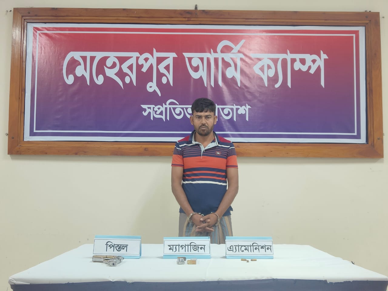 মেহেরপুরের গাংনী উপজেলায় বিদেশি পিস্তল, ২টি ম্যাগাজিন ও ৩ রাউন্ড তাজা গুলিসহ লাল্টু বিশ্বাস (৪০) নামে একজনকে আটক করেছে যৌথ বাহিনী। আজ শুক্রবার সকাল সাড়ে ৬টার দিকে গাংনীর লক্ষীনারায়নপুর ধলা গ্রামে অভিযান চালিয়ে তাকে আটক করা হয়। তিনি ওই গ্রামের মৃত আক্কাস আলীর ছেলে।