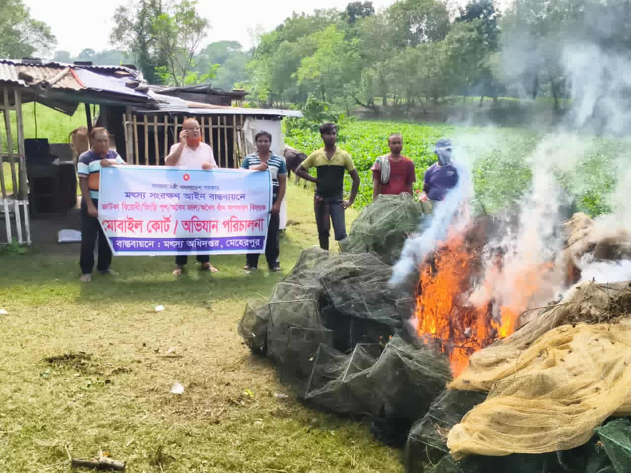 মেহেরপুর সদর উপজেলা সহকারী কমিশনার (ভূমি) ও নির্বাহী ম্যাজিস্ট্রেট সুমাইয়া জাহান ঝুরকা মোবাইল কোর্ট পরিচালনা করেন। তিনি বলেন, বিলুপ্তপ্রায় দেশীয় প্রজাতির মাছ সংরক্ষণ করার লক্ষ্যে সরকারিভাবে পদক্ষেপ গ্রহণ করা হয়েছে। সেখানে অসাধু ব্যক্তিরা অবৈধভাবে চায়না দুয়ারী জাল ফেলে দেশীয় প্রজাতির মাছ ধ্বংসের মুখে ঠেলে দিচ্ছে। তিনি আরও বলেন, আইনি প্রক্রিয়ার মাধ্যমে উদ্ধারকৃত এ সমস্ত জাল আগুনে পুড়িয়ে বিনষ্ট করা হয়েছে।
