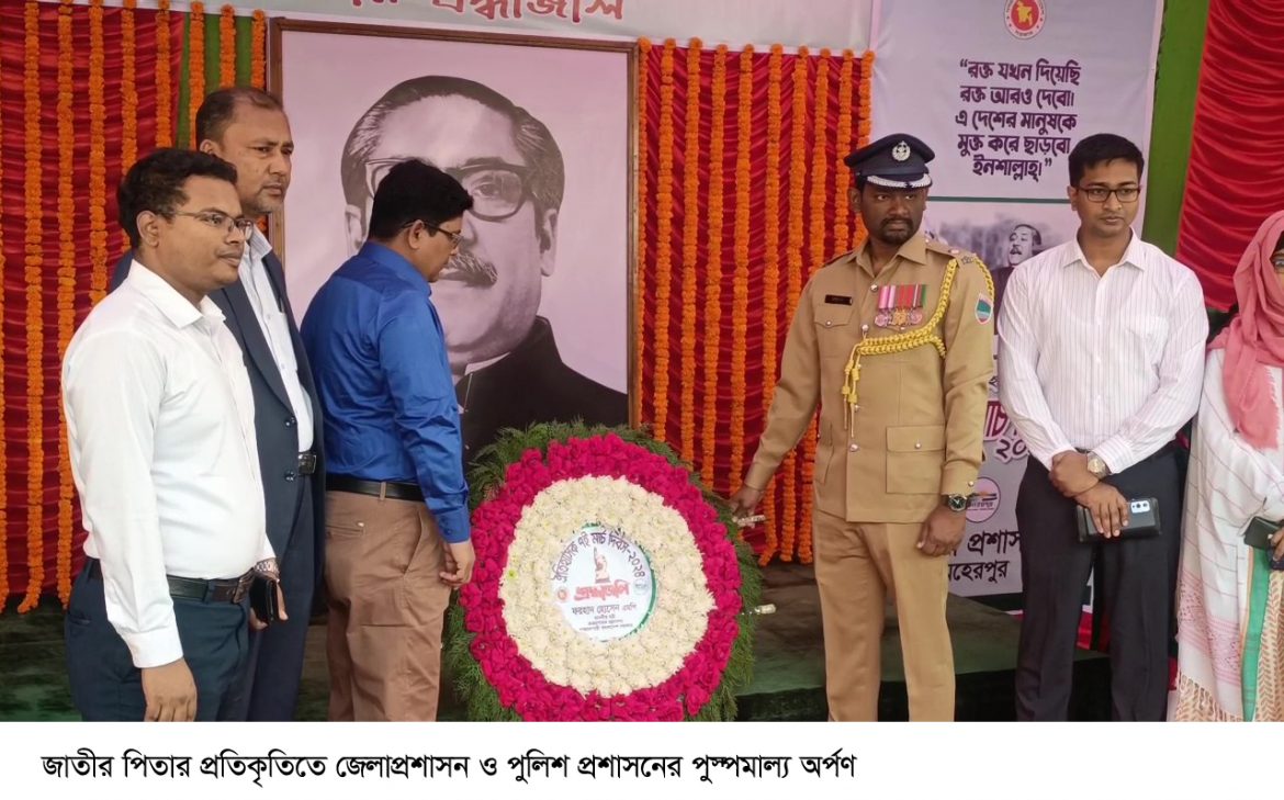 বৃহস্পতিবার সকালে জেলা প্রশাসক কার্যালয় চত্বরে অস্থায়ী ভাবে তৈরী বঙ্গবন্ধুর প্রতিকৃতিতে পুস্পমাল্য আর্পন করেন, জনপ্রশাসন মন্ত্রী ফরহাদ হোসেনের পক্ষে স্থানীয় সরকার বিভাগের উপ-পরিচালক মোঃ শামীম হোসেন। জেলা প্রশাসনের পক্ষ থেকেও পুষ্প মাল্য অর্পণ করেন তিনি। পরে জেলা পুলিশের পক্ষ থেকে অতিরিক্ত পুলিশ সুপার কামরুল আহসান, বীর মুক্তিযোদ্ধাদের পক্ষ থেকে বীর মুক্তিযোদ্ধা আব্দুল হালিম, জেলা আওয়মী লীগের সহ-সভাপতি আব্দুস সামাদ বাবলু বিশ্বাস, মেহেরপুর পৌর মেয়র মাহফুজুর রহমান রিটনসহ বভিন্ন সরকারি বেসরকারি অফিস ও শিক্ষা প্রতিষ্ঠান পুষ্প মাল্য অর্পণ করেন ।