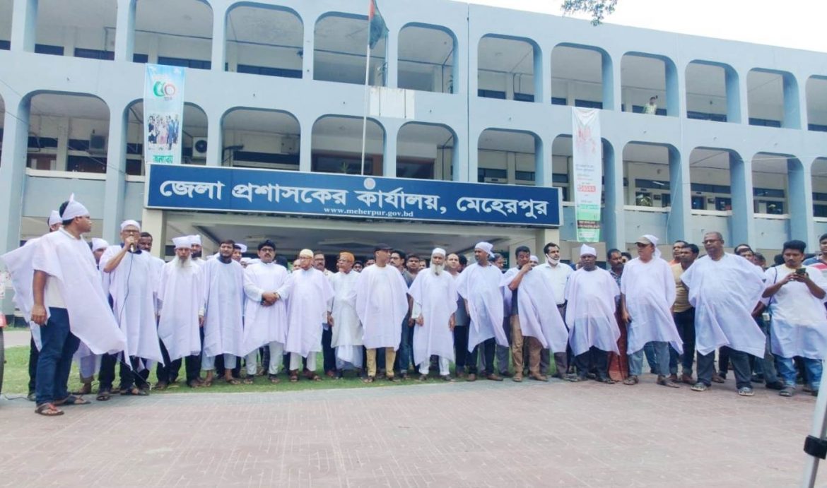 মেহেরপুর শহরের কোর্ট মসজিদ মার্কেট উচ্ছেদের প্রতিবাদ ও পূনর্বাসন দাবিতে কাফনের কাপড় পড়ে মৌনমিছিল করেছে ব্যাবসায়ীরা।