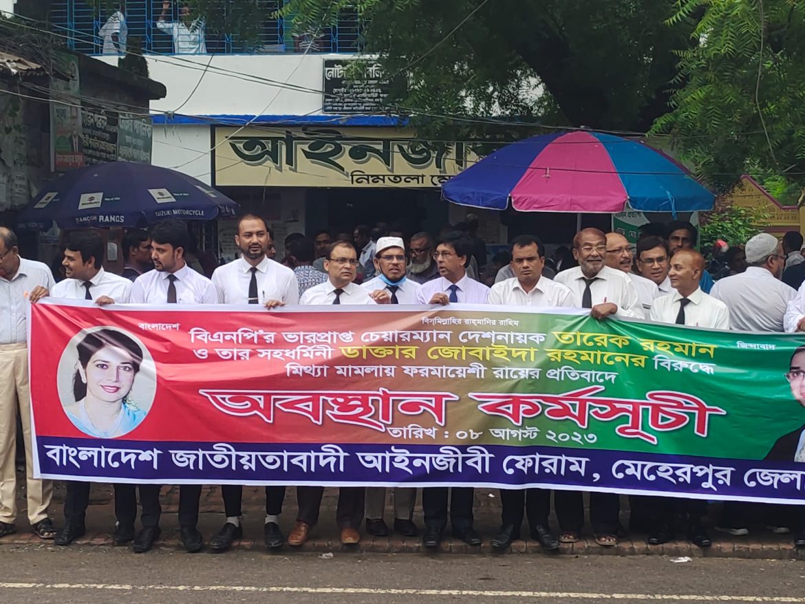 বিএনপি’র ভাইস চেয়ারম্যান তারেক রহমান ও জোবায়দা রহমানের মিথ্যা মামলার রায় এর প্রতিবাদে মেহেরপুরে জাতীয়বাদী আইনজীবী ফোরাম অবস্থান কর্মসূচি পালন করে।