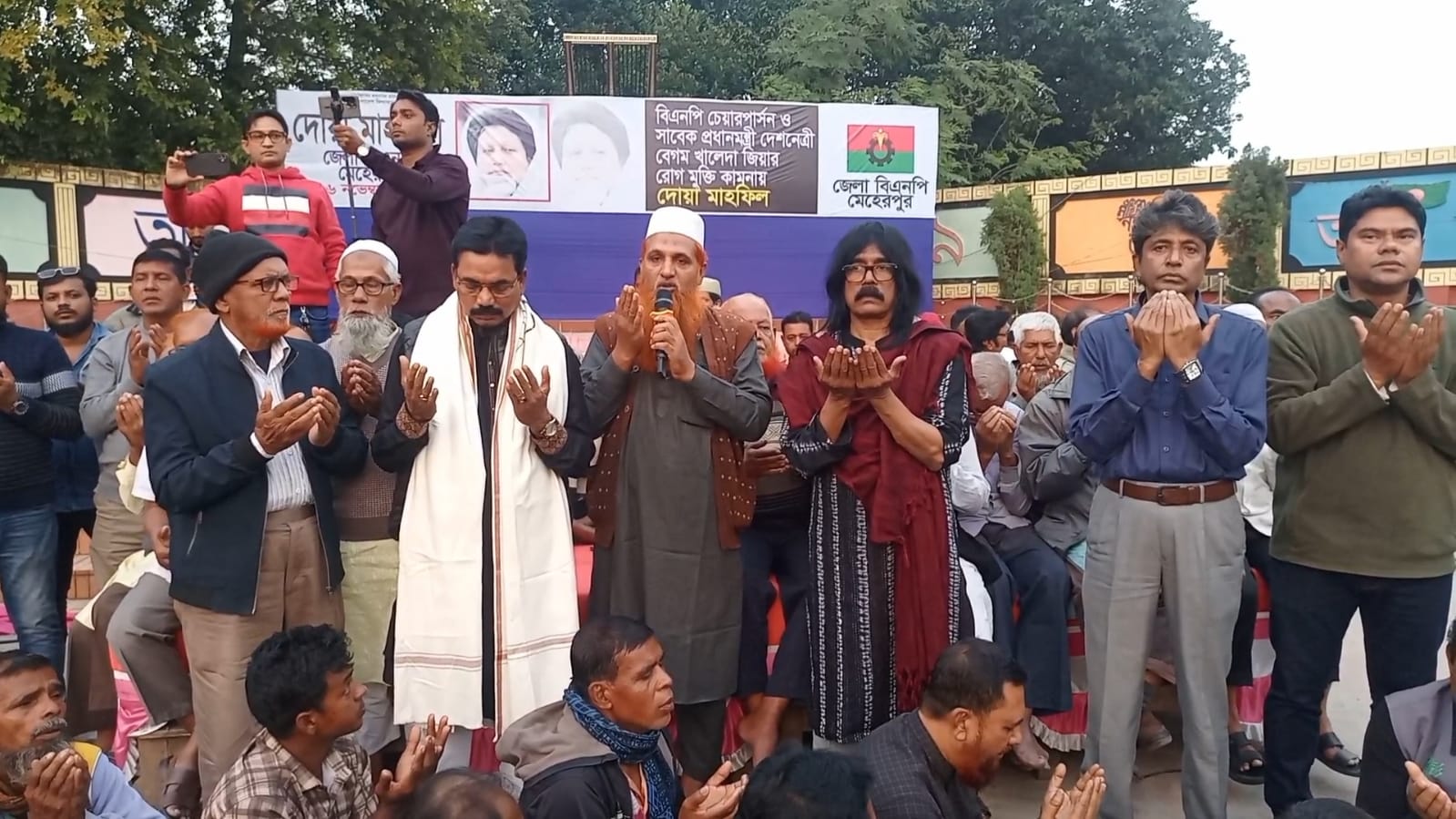 বিএনপি’র চেয়ারপার্সন সাবেক প্রধানমন্ত্রী বেগম খালেদা জিয়ার রোগ মুক্তি কামনায় আলোচনা সভা ও দোয়া মাহফিল অনুষ্ঠান করেছে মেহেরপুর জেলা বিএনপি। বুধবার বিকেলে ডক্টর শহীদ শামসুদ্দোহা পার্কে আলোচনা সভা ও দোয়া মাহফিল অনুষ্ঠিত হয়। এ সময় প্রধান অতিথি হিসেবে উপস্থিত ছিলেন বিএনপি’র কেন্দ্রীয় নির্বাহী কমিটির সদস্য ও মেহেরপুর ১ আসনের বিএনপির মনোনীত প্রার্থী মাসুদ অরুন, বিশেষ অতিথি হিসেবে উপস্থিত ছিলেন পৌর বিএনপির সাবেক সভাপতি জাহাঙ্গীর বিশ্বাস, জেলা বিএনপি’র সাবেক সাংগঠনিক সম্পাদক আব্দুর রশিদ, সদর উপজেলা বিএনপির সাবেক সভাপতি এ্যাডভোকেট মারুফ আহমেদ বিজন, সাবেক সাধারণ সম্পাদক সাইফুল ইসলাম, জেলা যুবদলের সভাপতি জাহিদুল হক জাহিদ, জেলা শ্রমিক দলের সভাপতি আহসান হাবীব সোনা, জেলা ছাত্রদলের সভাপতি আকিব জাভেদ সেনজির, জেলা তাতী দলের সভাপতি আরজুল্লাহ মাস্টার বাবলু সহ বিএনপির সকল অঙ্গসংগঠনের নেতৃবৃন্দ। আলোচনা সভা শেষে বিএনপির চেয়ারপার্সন বেগম খালেদা জিয়ার রোগ মুক্তি ও দীর্ঘায়ু জীবন কামনা করে দেশের কল্যাণে কাজ করার জন্য দোয়া পরিচালনা করেন মেহেরপুর বোসপাড়ার বায়তুল ফালাহ জামে মসজিদের ইমাম সিরাজুল ইসলাম।