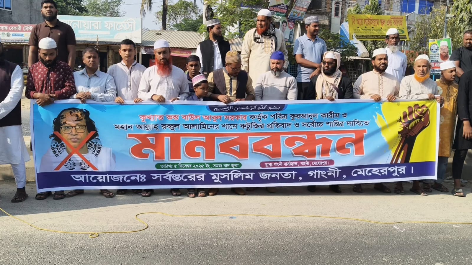 বাউল আবুল সরকার কর্তৃক পবিত্র কুরআনুল কারীম ও মহান আল্লাহ্ রব্বুল আলামিনের শানে কটূক্তির প্রতিবাদে এবং তাঁর দৃষ্টান্তমূলক শাস্তির দাবিতে মেহেরপুরের গাংনীতে মানববন্ধন অনুষ্ঠিত হয়েছে। শুক্রবার জুম্মার নামাজ শেষে শহীদ আবু সাঈদ চত্বরে এ মানববন্ধনে বিপুলসংখ্যক মানুষ অংশগ্রহণ করেন। মানববন্ধন আয়োজন করে গাংনীর সর্বস্তরের মুসলিম জনতা। মানববন্ধনে বক্তব্য রাখেন গাংনী বাজার মসজিদের ইমাম মাওলানা মুফতি রুহুল আমিন, গাংনী বাজার কমিটির সাবেক সভাপতি ইঞ্জিনিয়ার সালাউদ্দিন শাওনসহ স্থানীয় মুসল্লিগণ। বক্তারা বলেন, একজন বাউলের অজ্ঞতা ও ঔদ্ধত্যের কারণে ধর্মপ্রাণ মুসলমানদের হৃদয়ে আঘাত লেগেছে। তারা আরও বলেন, ধর্মীয় মূল্যবোধ ও পবিত্র কুরআনের মর্যাদা রক্ষায় আইন অনুযায়ী আবুল সরকারের বিরুদ্ধে দ্রুত ব্যবস্থা গ্রহণ করতে হবে। একই সঙ্গে এ ধরনের কটূক্তিকারীদের বিচার নিশ্চিত করে সামাজিক শান্তি ও সম্প্রীতি বজায় রাখার আহ্বান জানান। বক্তারা আইনশৃঙ্খলা বাহিনীর প্রতি অনুরোধ জানিয়ে বলেন, সামাজিক মাধ্যমে ধর্মীয় বিদ্বেষ ছড়ানোর ঘটনা দিন দিন বাড়ছে। এ ধরনের অপকর্ম বন্ধে নজরদারি বাড়ানো এবং অপরাধীদের আইনের আওতায় আনা জরুরি। উল্লেখ্য, এর আগের দিন বৃহস্পতিবার (৪ ডিসেম্বর) দুপুরে আবুল সরকারের মুক্তির দাবিতে গানে গানে মানববন্ধন করে মেহেরপুরের বাউল সম্প্রদায়ের একাংশ।