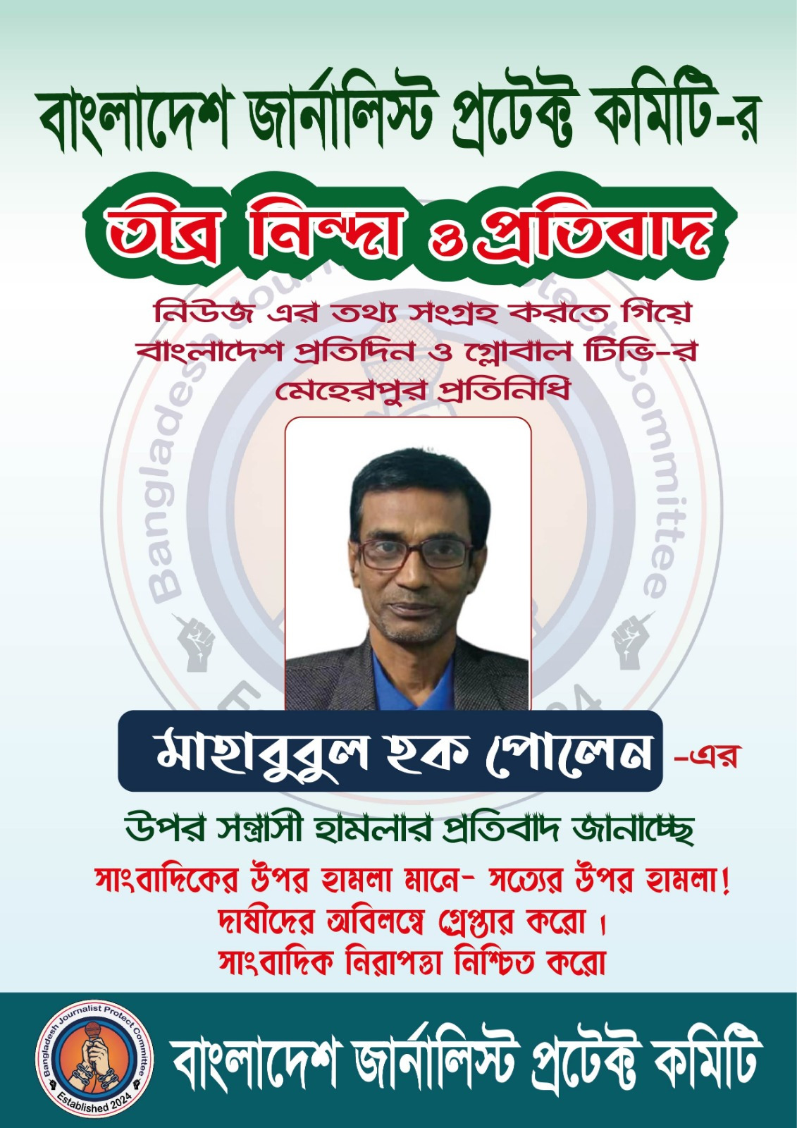 প্রতিবাদে তারা বলেন. সম্প্রতি সরকারি রাস্তা দখল করে নির্মাণকাজ করায় স্থানীয় জনগণের প্রতিবাদের মুখে পরিস্থিতি উত্তপ্ত হয়ে ওঠে। এই ঘটনার সংবাদ সংগ্রহে গেলে সাংবাদিক মাহবুবুল হক পোলেনুএর ওপর চরম অসদাচরণ ও হামলার ঘটনা ঘটে। সংবাদ সংগ্রহের দায়িত্ব পালনের সময় হাবিব ইকবাল তার ওপর চড়াও হয়ে অফিসিয়াল মোবাইল ফোন ও ক্যামেরা ছিনিয়ে নেয় এবং ধারণকৃত ছবিুভিডিও জোরপূর্বক মুছে দেন, যা গণমাধ্যমের স্বাধীনতার ওপর সরাসরি আঘাত। ঘটনার পর সাংবাদিক মাহবুবুল হক পোলেন আইনগত ব্যবস্থা গ্রহণের লক্ষ্যে মেহেরপুর সদর থানাুএ লিখিত অভিযোগ দায়ের করেছেন।এ ঘটনায় বাংলাদেশ জার্নালিস্ট প্রটেক্ট কমিটি(বিজেপিসি) দৃঢ়ভাবে ঘোষণা করছে—গণমাধ্যমের স্বাধীনতা ও সাংবাদিকের নিরাপত্তা রক্ষার স্বার্থে এই ঘটনায় জড়িত সকল ব্যক্তিকে অবিলম্বে চিহ্নিত করে গ্রেফতার করতে হবে এবং দৃষ্টান্তমূলক শাস্তির ব্যবস্থা নিশ্চিত করতে হবে। সংবাদ সংগ্রহে বাধা, হামলা এবং তথ্য নষ্ট করা—সংবিধান স্বীকৃত অধিকার লঙ্ঘনের সামিল, যা কোনোভাবেই বরদাশতযোগ্য নয়। অন্যথায় সংগঠনটি কঠোর কর্মসূচি দিতে বাধ্য হবে। সকশেষে বিজেপিসি সংশ্লিষ্ট প্রশাসনের জরুরি হস্তক্ষেপ কামনা করে এবং সাংবাদিক সম্প্রদায়ের নিরাপত্তা নিশ্চিতের জন্য দ্রুত কার্যকর ব্যবস্থা গ্রহণের দাবি জানায়।