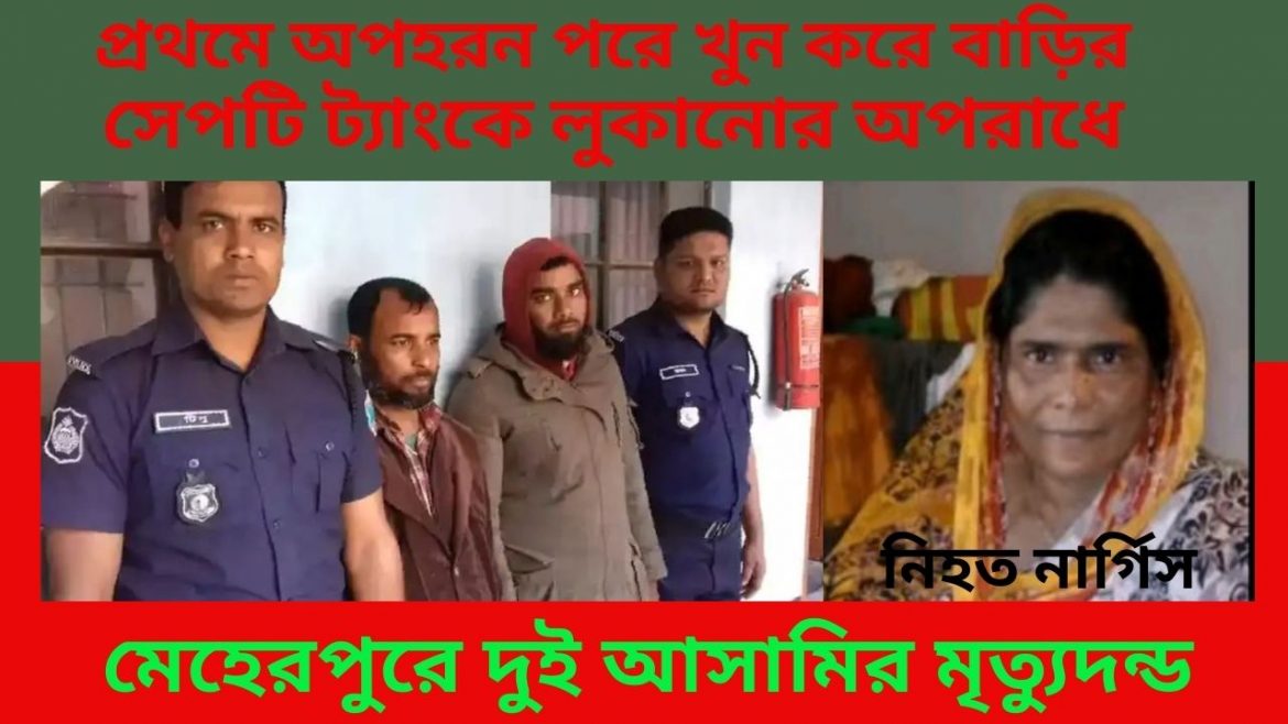 মেহেরপুরের গাংনী উপজেলা সাহেবনগর গ্রামের নার্গিস কে অপহরন করে খুন করে বাড়ির সেপটি ট্যাংকে লুকানোর অপরাধে দুই আসামিকে মৃত্যুন্ডের রায় দিয়েছেন আদালত। সেই সাথে তিনটি ধারায় ৪০ হাজার টাকা জরিমানা আনাদায়ে আরো ৪ বছরের স্বশ্রম কারাদন্ডের আদেস দিয়েছেন আদালত। আজ রবিবার দুপুরে অতিরিক্ত জেলা ও দায়রা জজ আদালতের বিচারক রিপতি কুমার বিশ্বাস এ দণ্ডাদেশ দেন।
