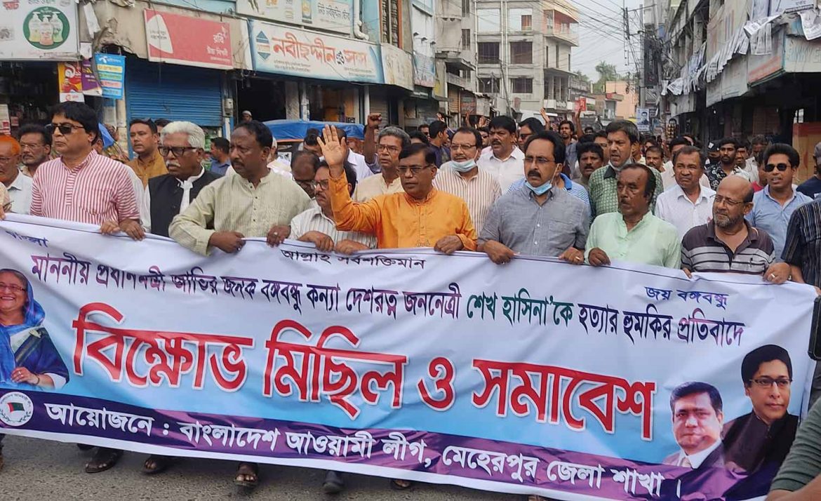 আওয়ামী লীগ সভানেত্রী ও প্রধানমন্ত্রী শেখ হাসিনাকে ‘হত্যার হুমকি ও দেশব্যাপী বিএনপির নৈরাজ্যের ষড়যন্ত্রের’ প্রতিবাদে কেন্দ্রীয় কর্মসূচির অংশ হিসেবে মেহেরপুরে বিক্ষোভ মিছিল ও প্রতিবাদ সমাবেশ অনুষ্ঠিত হয়েছে।
