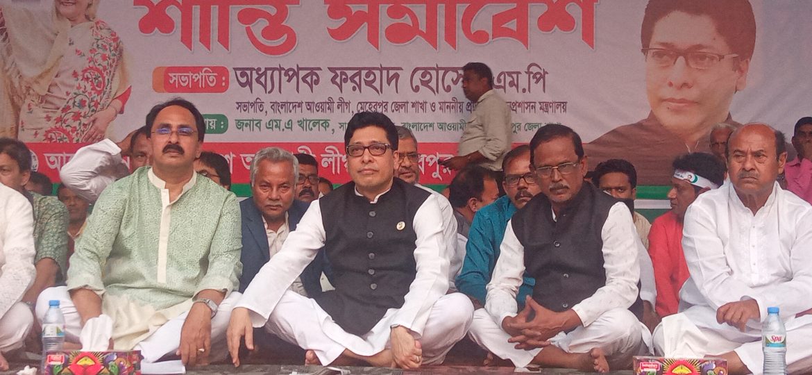 মেহেরপুর জেলা আওয়ামী লীগের সভাপতি ও জনপ্রশাসন প্রতিমন্ত্রী অধ্যাপক ফরহাদ হোসেন এমপি‘র সভাপত্বিতে শনিবার বিকালে মেহেরপুর শহিদ শামসুজ্জোহা নগর উদ্যানে এ শান্তি সমাবেশ অনুষ্ঠিত হয়।