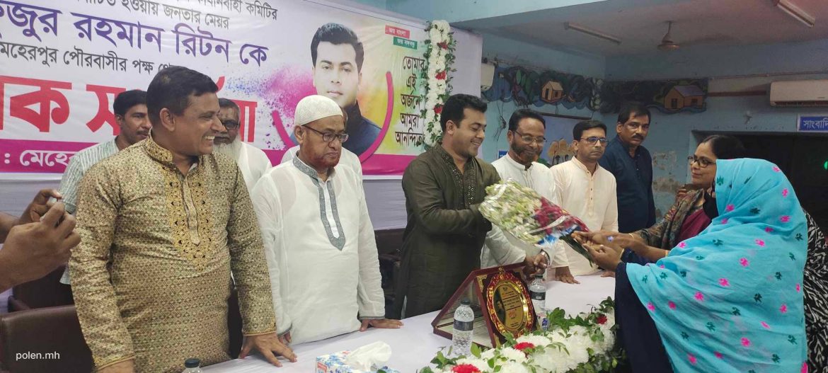 এর আগে নাগরিক সংবর্ধনা অনুষ্ঠানে মেহেরপুর পৌরসভার কাউন্সিলার বৃন্দ, ব্যবসায়ী সমিতি, সামাজিক সাংস্কৃতিক সংগঠন সহ বিভিন্ন সংগঠন ও পেশাজিবীদেও পক।ষ থেকে মে পক্ষ থেকে পৌর মেয়র মাহফুজুর রহমান রিটনকে ক্রেস্ট প্রদান ও ফুলেল শুভেচ্ছা জানানো হয়।