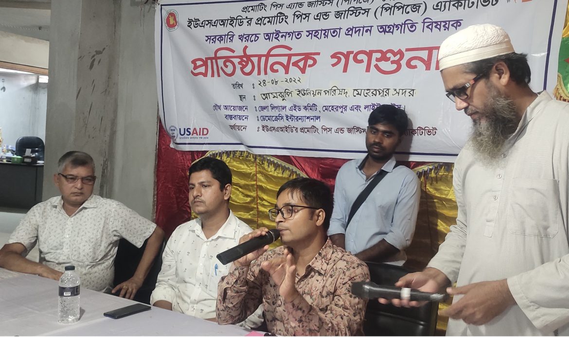 বুধবার দুপুরে সরকারি খরচে আইন সহয়তা প্রদান বিষয়ে সচেতনতা বাড়াতে ও দেশের মামলা জট কমানোর জন্য জেলা লিগ্যাল এইড মেহেরপুর ও লাইট হাউজ মেহেরপুরের যৌথ আয়্জেনে মেহেরপুর আমঝুপি ইউনিয়ন পরিষদে প্রাতিষ্ঠানিক গনশুনানি অনুষ্ঠিত হয়।